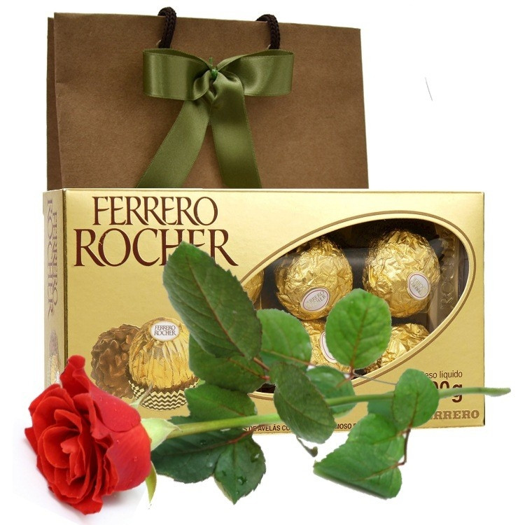 Perfeita combinação de um maravilhoso solitário de rosa vermelha e uma caixa de bombons Ferrero Rocher 100g. Irresistível!